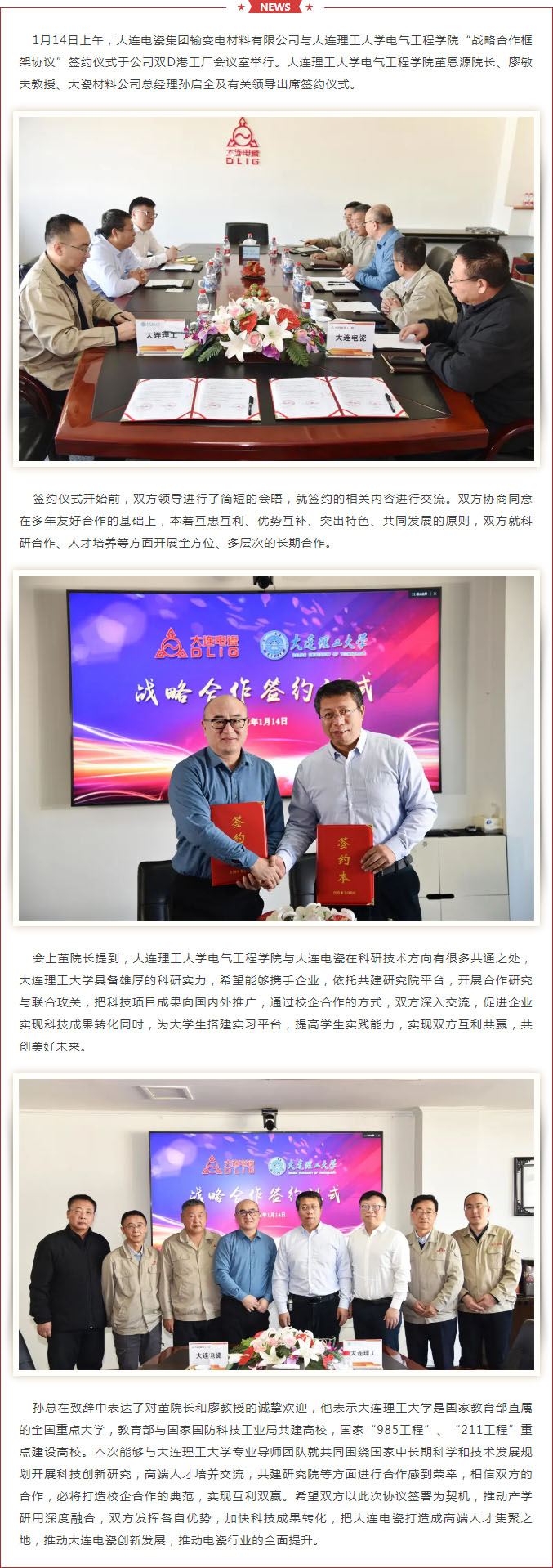 大连电瓷集团输变电材料有限公司与大连理工大学电气工程学院签署“战略合作框架协议