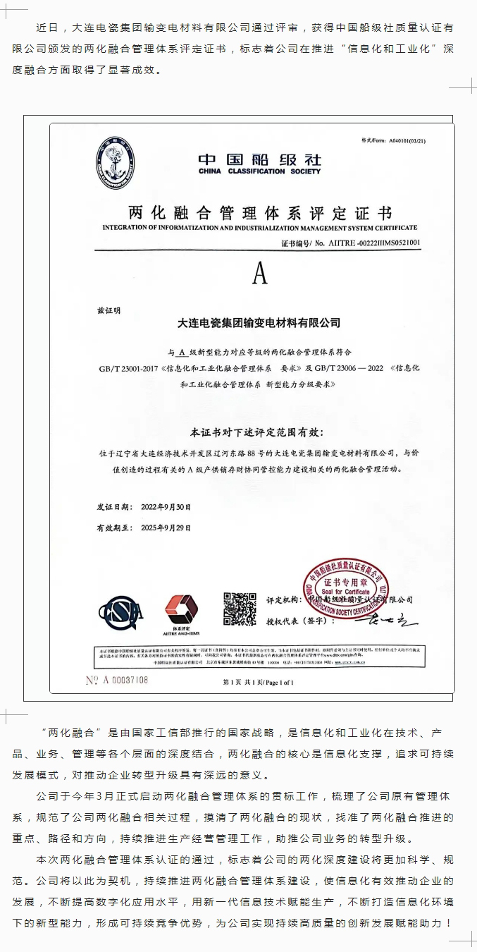 大连电瓷集团输变电材料有限公司通过两化融合管理体系认定