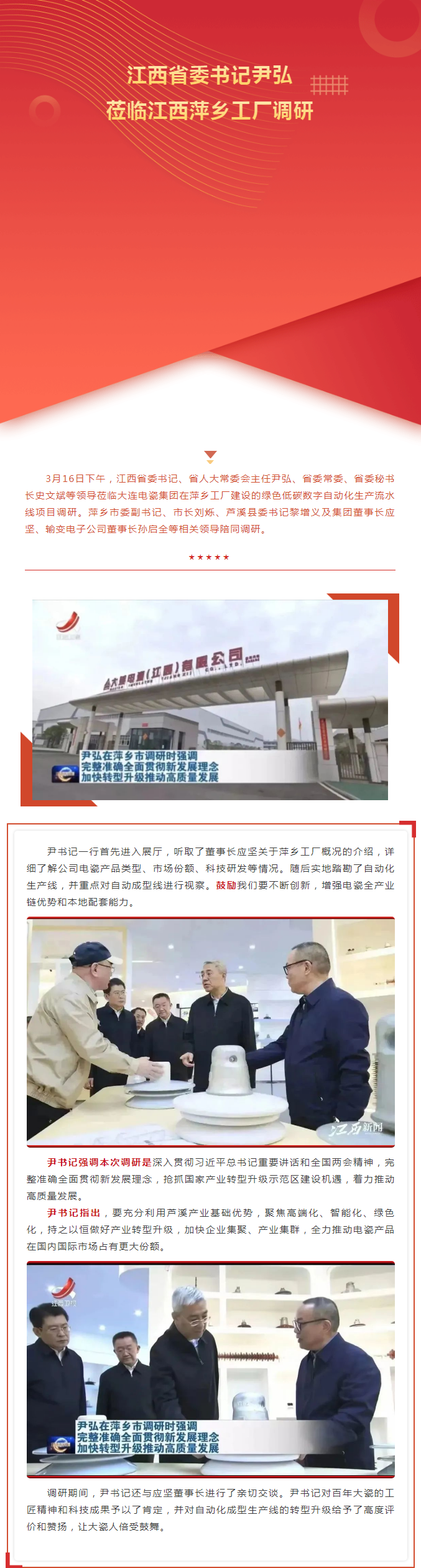江西省委书记尹弘莅临江西萍乡工厂调研